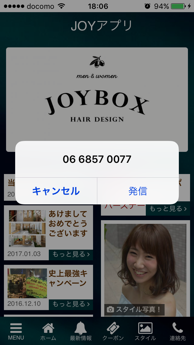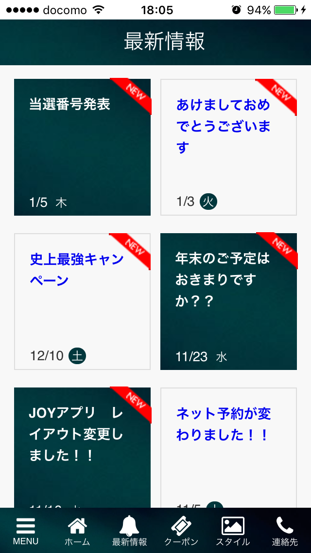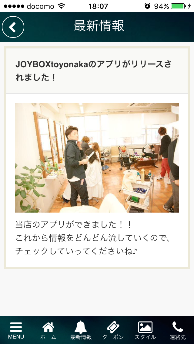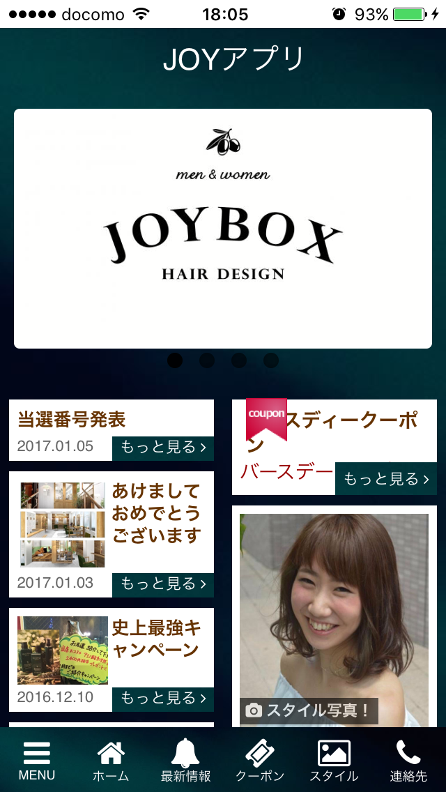 お知らせでは新商品の情報やセール情報をいち早くお届けします。 クーポンではアプリ限定の割引クーポンを公開しています フォトでは新メニューやスタッフの紹介をご覧いただけます 予約ではアプリからお店の予約ができます。