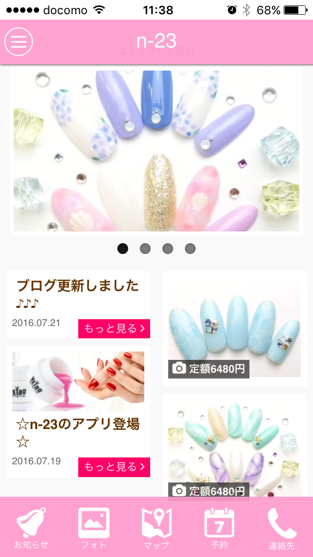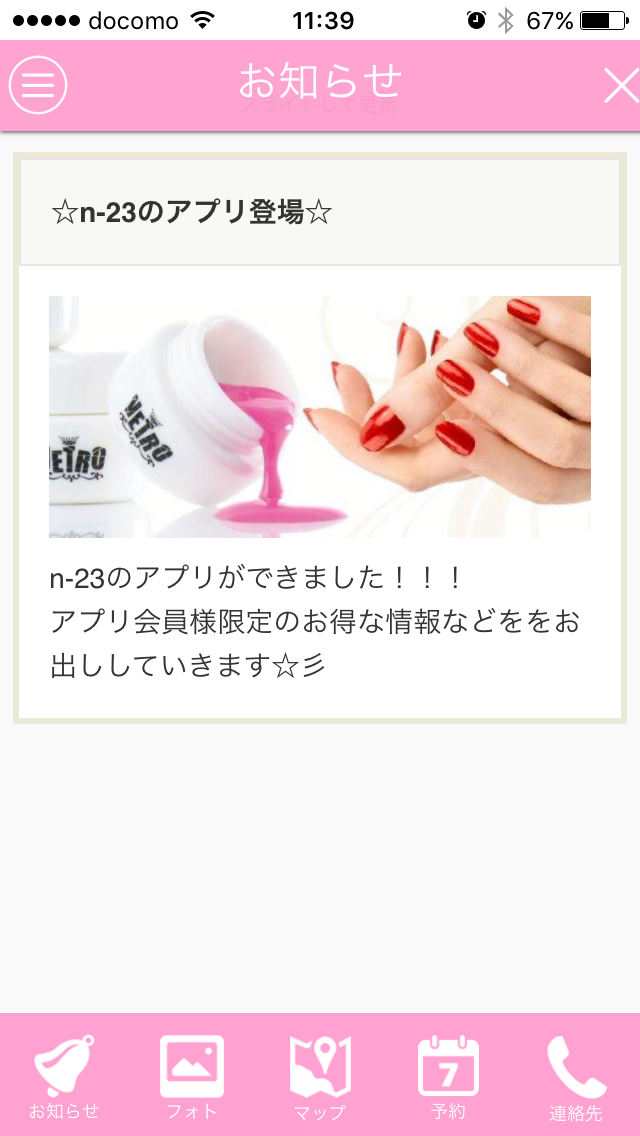 池袋にあるネイルサロンn-23(エヌツースリー)の会員専用アプリ。 お知らせでは新商品の情報やセール情報をいち早くお届けします。 フォトでは新メニューをご覧いただけます。 予約ではアプリからお店の予約ができます。