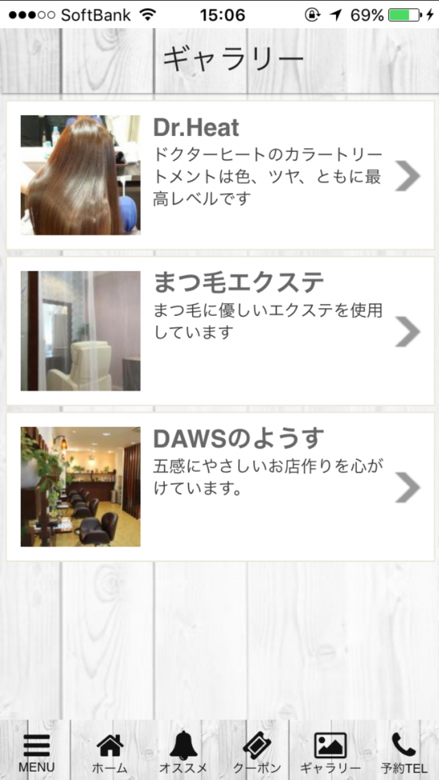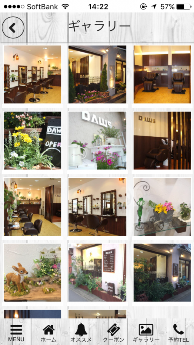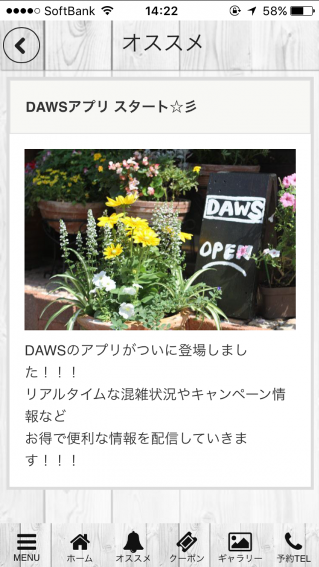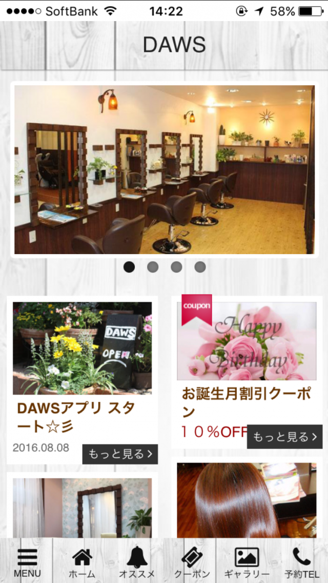 お知らせでは新商品の情報やセール情報をいち早くお届けします。 クーポンではアプリ限定の割引クーポンを公開しています フォトでは新メニューやスタッフの紹介をご覧いただけます 予約ではアプリからお店の予約ができます。
